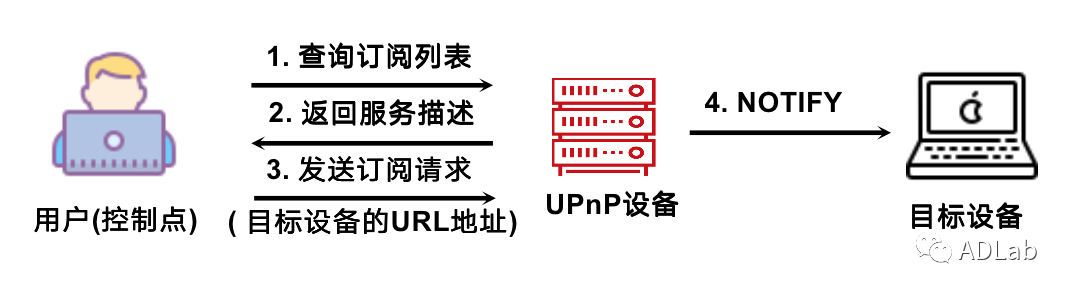 在UPnP协议规范中有一个非常重要的功能模块,叫做事件(Eventing)。在UPnP服务进行的时间内,只要设备用于UPnP服务的变量值发生变化或者模式发生了改变,就会产生一个事件,随之向整个网络进行广播。或者用户可以事先向UPnP设备发送订阅请求,保证UPnP设备及时地将事件传送过来。