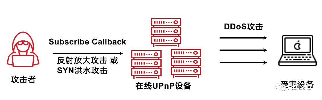 如前文协议规范中提到的,若CALLBACL Value中定义了不止一个URL,则会按顺序尝试TCP连接,直到有一个连接成功。那么攻击者可在CALLBACK Value中精心构造多个URL,使每一个都无法连接成功,这样UPnP设备就会用多个SYN包依次对每个URL尝试TCP握手。假设攻击者可以操控很多个设备,就会导致受害设备遭受DDoS攻击。