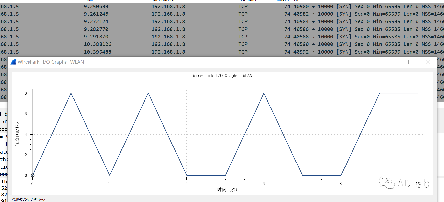 SYN数据包的数量根据设备操作系统和配置的不同而不同,利用某品牌智能电视对受害设备进行SYN洪水攻击测试,测试结果如下图所示。