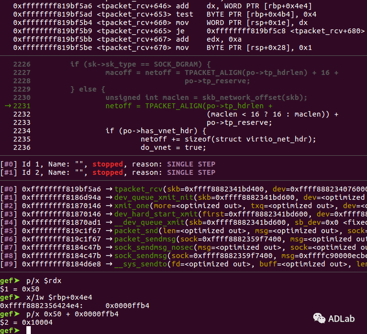 因此,在计算netoff时,可以通过控制tp_reserve造成整数溢出,进而计算出错误的macoff。当执行到如下代码时: