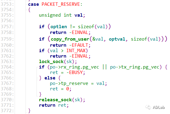 由于macoff、netoff以及maclen被定义为unsigned short类型,最大值为0xffff。而tp_reserve被定义为unsigned int类型,最大值为0xffffffff,而且大小可以通过setsockopt()函数进行设置,如下代码所示: