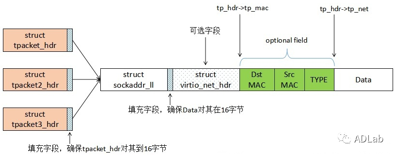 通过setsockopt()函数设置环形缓冲区,option参数设置为PACKET_RX_RING或PACKET_TX_RING。为了方便内核与用户层管理和交互环形缓冲区中的数据帧,内核定义了TPACKET_HEADER结构体,该结构体存储着一些元信息如套接字地址信息、时间戳以及环形缓冲区管理信息等。如果通过setsockopt()函数设置了PACKET_VNET_HDR选项,还需添加一个virtio_net_hdr结构体。一个数据帧包含两个部分,第一部分为TPACKET_HEADER,第二部分为Data,而且要保证页面对齐,如下图所示: