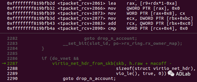 行2287,调用virtio_net_hdr_from_skb()函数从sk_buff中拷贝数据,该函数第二个参数为h.raw + macoff – sizeof(struct virtio_net_hdr),h.raw为tpacket_rcv_uhdr类型的指针,指向环形缓冲区的frame,由于macoff是可控的,可以让maoff小于sizeof(struct virtio_net_hdr),导致向前越界写,最多可写入sizeof(struct virtio_net_hdr)个字节。根据提供的PoC,调试代码如下图所示:
