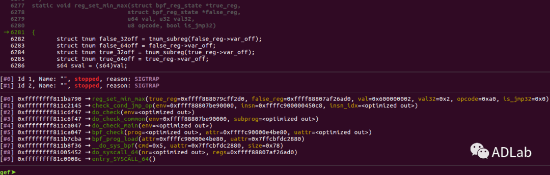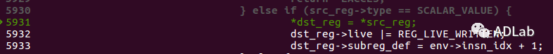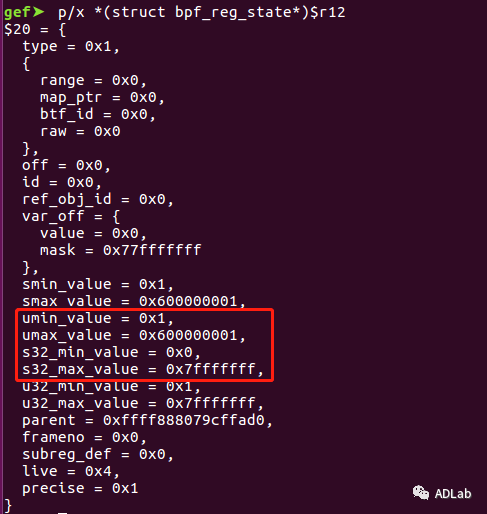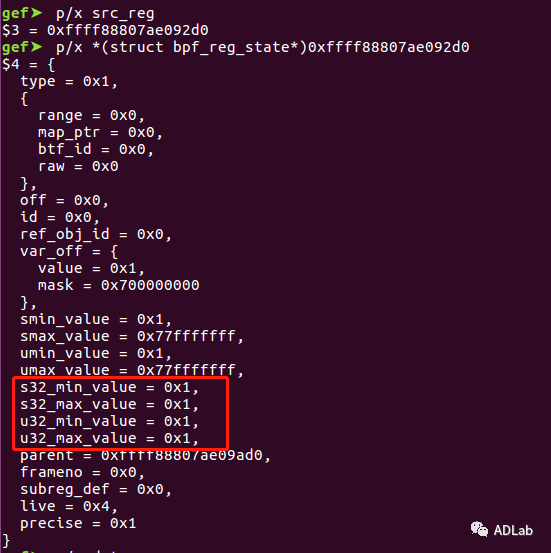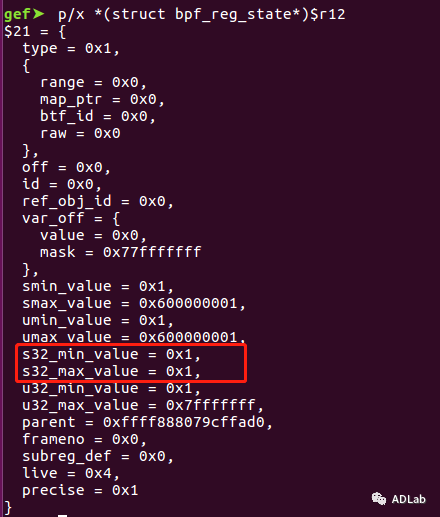 此时s32_min_value和s32_max_value都为0x1,在验证器中,R6寄存器的32位有符号取值为常数1。但R6寄存器的取值实际是有范围的。接着将R6寄存器进行32位MOV到R7寄存器中,执行到如下代码所示: