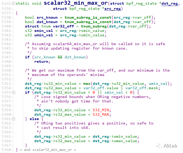 该漏洞和Pwn2own2020比赛中使用的CVE-2020-8835漏洞原理一致,均是错误计算了寄存器边界跟踪,导致可以绕过验证器检查达到越界读写。缺陷代码出现在kernel/bpf/verifier.c的scalar32_min_max_or()函数中,该函数是在commit_id:3f50f132d840中引入的,该功能实现了显式的ALU32(32位计算类操作)寄存器边界跟踪,处理OR运算时,调用scalar32_min_max_or()函数进行32位寄存器边界跟踪,该函数实现如下: