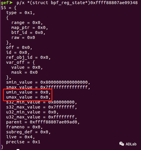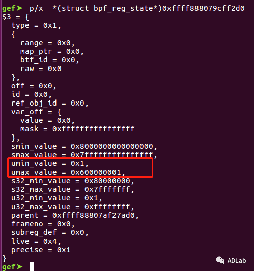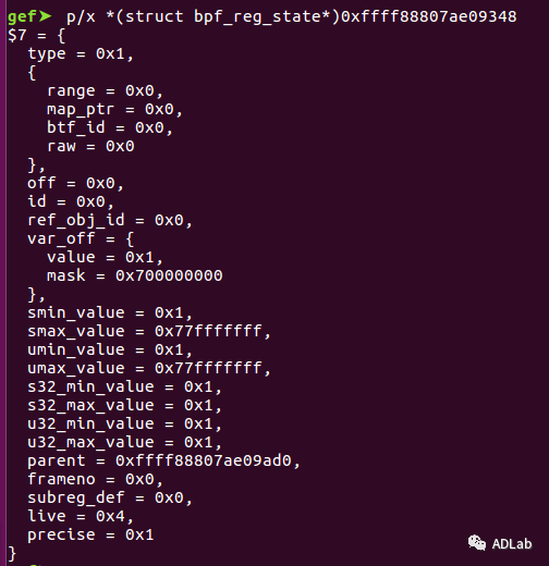 此时umin_value和umax_value为0,即为R7寄存器进行右移操作后,在验证器中被识别为常数0,此时R7寄存器进行加减运算都不会发生越界,绕过了验证器的边界检查。但是如果R7寄存器实际设置为2,2>>1为1,R7寄存器为1,此时和R7寄存器进行加减运算,达到越界读写。
