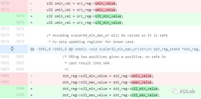 行5365和行5366,直接将dst_reg寄存器中的64位无符号值赋值给32位有符号值,这明显是错误的。例如设置dst_reg->umin_value=1,dst_reg->umax_value=0x600000001,当进行如上操作后,dst_reg->s32_min_value为1,但是dst_reg->s32_max_value也将是1,因为0x600000001的高位将被截断,这时dst_reg寄存器的范围从[1,0x600000001]变成了[1,1],这会被验证器识别为常数1,进而绕过验证器检查。漏洞补丁中,进行了正确的32位有符号值赋值操作,如下所示: