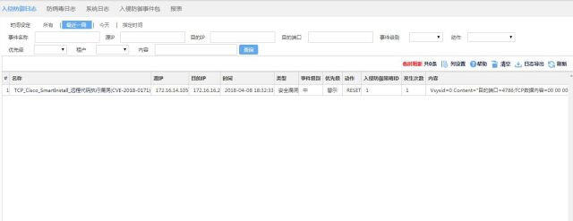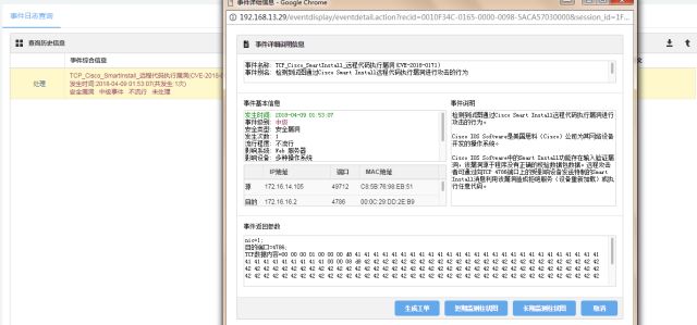 2.启明星辰已于4月4日升级事件库,事件名称:TCP_Cisco_SmartInstall_远程代码执行漏洞(CVE-2018-0171),请广大用户及时升级。