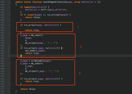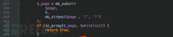 该函数内,有三处返回ture的地方,只要有任意一处返回ture就可以。观察这三处,有一个共同点,都是需要$page在$whitelist数组中内才会返回true。