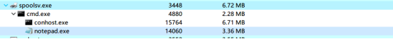 随后查看spoolsv.exe下的所有子进程,发现该notepad.exe程序被spoolsv.exe程序重新打开,和github上的漏洞利用的demo中的效果一致,可以确定漏洞利用成功。