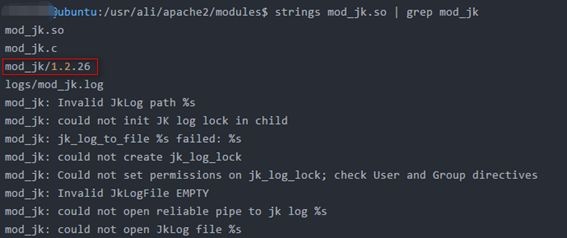 使用strings直接查看mod_jk.so。命令如下:strings mod_jk.so | grep mod_jk