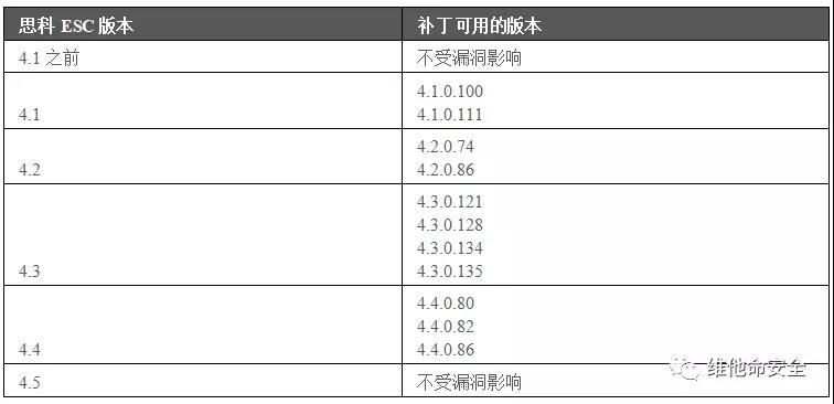 此漏洞已在Cisco Elastic Services Controller版本4.5中修复。其它补丁可用的版本见下表: