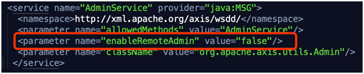 到网站目录下找到server-config.wsdd文件,用文本编辑器打开,找到enableRemoteAdmin配置项,将值设置为false,如图所示: