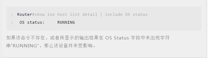 管理员可在设备CLI中使用命令show iox host list detail查看设备上是否启用了客户机操作系统。思科在安全公告中提供了如下示例,说明了启用了客户机操作系统的命令输出结果: