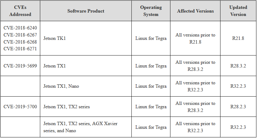 NVIDIA发布了针对Jetson AGX Xavier,TK1,TX1,TX2和Nano芯片的Tegra Linux驱动程序包(L4T)中的六个高危漏洞的安全更新,这些漏洞用于奔驰的MBUX信息娱乐系统和博世自动驾驶计算机系统中。受这些漏洞影响的芯片还用于HP和Acer Chromebook,Android平板电脑,Nintendo Switch视频游戏机和Magic Leap One虚拟视网膜显示器。这些安全漏洞可能使具有不同级别用户权限的本地攻击者能够执行任意代码,提升权限,触发拒绝服务(DoS)状态,并针对未打补丁芯片的设备发起信息泄露攻击。漏洞概述如下: