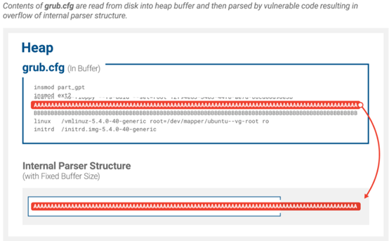 BootHole漏洞是解析grub.cfg文件时在GRUB2中发生的缓冲区溢出。此配置文件是通常位于EFI系统分区中的外部文件,因此可以由具有管理员特权的攻击者修改,而无需更改已签名供应商shim和GRUB2 bootloader可执行文件的完整性。缓冲区溢出使攻击者可以在UEFI执行环境中获得任意代码执行权限,该代码可以用于运行恶意软件,更改启动过程,直接修补OS内核或执行恶意代码。