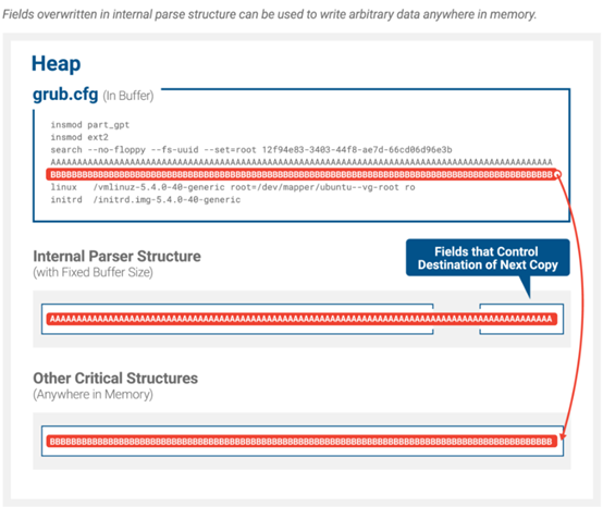鉴于GRUB2 解析配置文件的方法中存在一个弱点,攻击者可以执行任意代码,绕过签名验证。BootHole漏洞可被用于安装可持久和隐秘的bootkit或者即使在启用Secure Boot 的情况下也可运行的恶意引导程序。攻击者能够在操作系统之前运行恶意代码并控制操作系统的加载方式、直接修复操作系统、甚至使引导程序修改OS镜像。