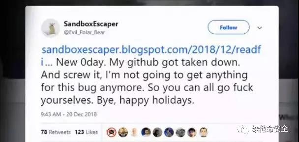 5、SandboxEscaper第三次在Twitter上披露未修复的Windows 0day