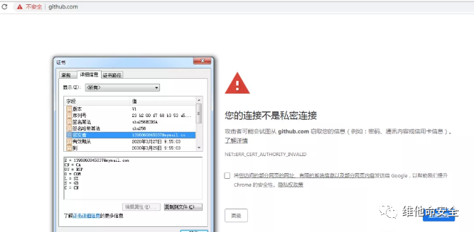 3月26日有攻击者针对Github和京东等网站发起大规模中间人攻击,目前受影响的主要是部分地区用户,但涉及所有运营商,例如中国移动、中国联通、中国电信以及教育网均可复现劫持问题,而国外网络访问这些站点并未出现异常情况。从目前网上查询的信息可以看到此次攻击涉及最广的是GitHub.io,其次用户访问京东等国内知名网站亦会报错。查看证书信息可以发现这些网站的证书被攻击者使用的自签名证书代替,导致浏览器无法信任从而阻止用户访问。目前全网绝大多数网站都已经开启加密技术对抗劫持,因此用户访问会被阻止而不会被引导到钓鱼网站上去。此次攻击似乎是通过骨干网络劫持443端口,目前经测试DNS系统解析是完全正常的。