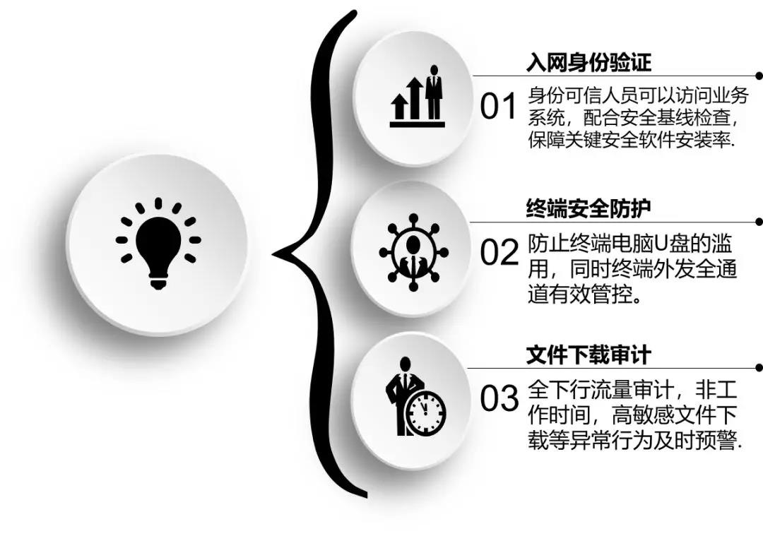 针对这种情况,启明星辰推出针对知识产权的整体安全防护解决方案,以人为核心重新定义数据安全防护模型,从人员身份和终端环境的合规性为安全基线,同时对终端的所有数据安全风险点进行防护,以及配合对服务器下载敏感数据的审计,与终端进行联动,就敏感数据定位到人,一旦出现安全事件可有效追溯到自然人,形成在知识产权安全防护的闭环。