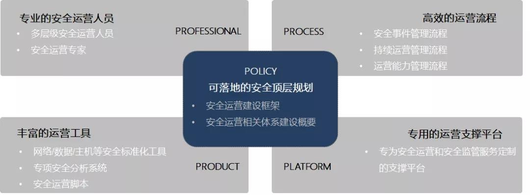 对于云平台的未来建设,安全其实已经是一个重点关注。有关机构预测随着越来越多涉及民生的系统上云,云服务商可能会承担更多的安全责任,也驱动云服务商更多的考虑安全规划。另外,随着业务与技术的发展,传统的安全服务可能已不能满足需求,新的安全运营模式或将解决这一难题。在具体安全运营建设规划下,首先是安全运营的5个核心要素,即:Policy安全策略 、Professional专业人员、Product安全工具、Platform安全运营支撑平台、Process运营流程。