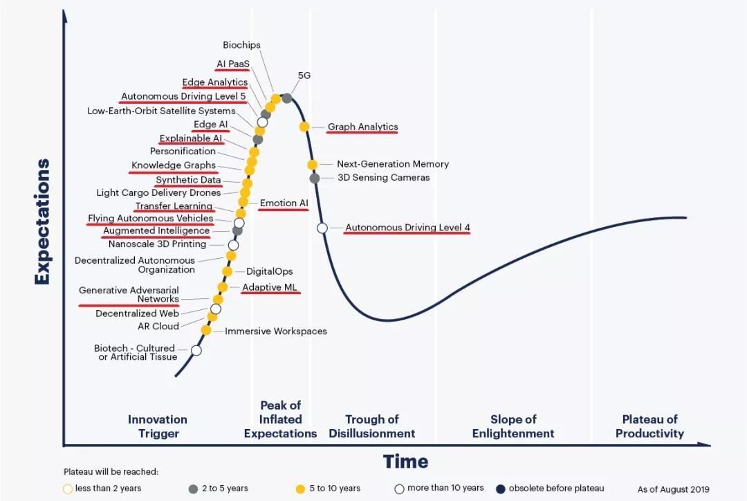 2019年Gartner新兴技术成熟度曲线(人工智能相关技术用红色下划线标示)