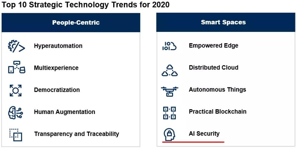 2019年10月,Gartner发布了2020十大战略性技术趋势,其中“AI Security”(人工智能安全)位列其中。但是,这里的人工智能安全不仅是指将人工智能技术用于网络安全防御,而是给出了它的三维含义,即保护AI赋能的系统、利用AI来提升安全防御以及对AI的恶意使用。