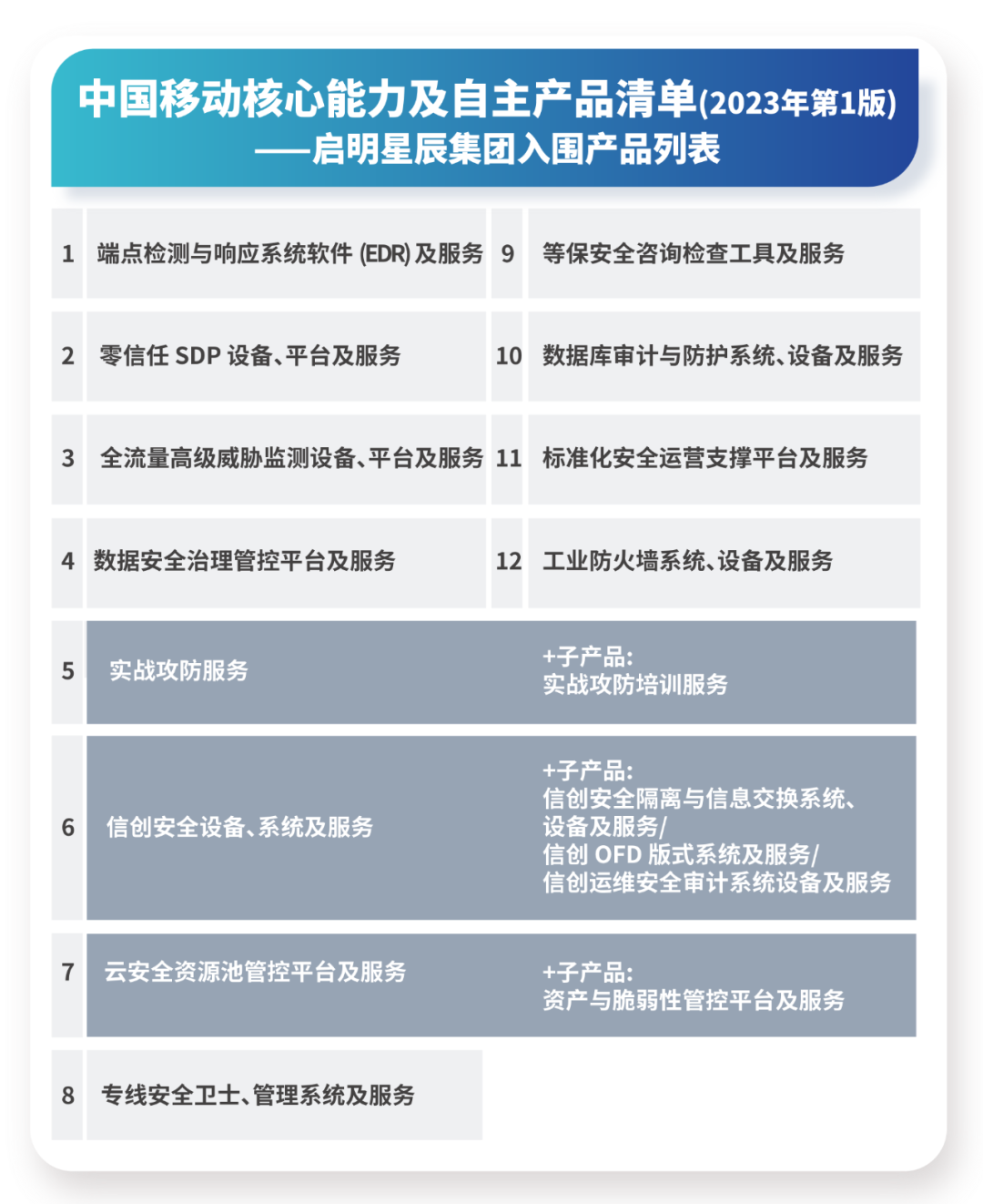 发布时间 2023-06-06近日,《中国移动核心能力及自主产品清单(2023年第1版)》正式发布,继上期入围8款产品后,新版清单中启明星辰集团新入围4款产品及4款子产品 ,累计进入中国移动核心能力及自主产品清单12款产品(17款子产品),涉及启明星辰集团下属启明星辰、网御星云、书生电子3家全资子公司。