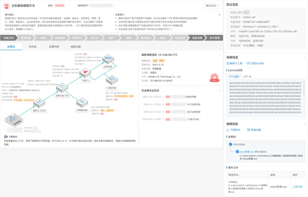 shellcode下载完毕后,受害主机开始外联C2服务器进行通信。通过XDR的自动研判取证,我们可以看到完整的看到从“银狐”上线数据包中解密出来的上线信息,从而快速定位失陷主机。