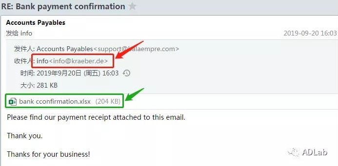 通过图2可以看到,攻击者可以从该公司的主页上获取邮箱地址,并将自身伪装成“付款确认”等通知邮件,诱使受害者打开附件文档。