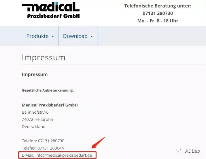 另一名受害者是德国的一家医疗药品器械公司。该收件邮箱地址同样可在其官网上获取。