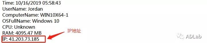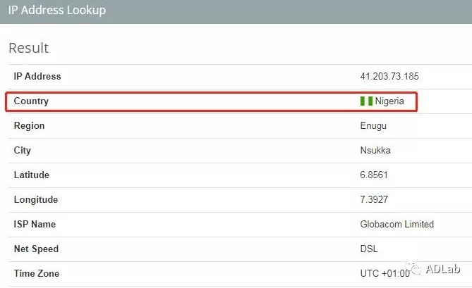 此外,在另外的Keystrokes日志中再次发现的IP地址“41.203.73.185”与前文中我们记录的IP地址相同,其也是指向尼日利亚地区。具体信息如下图: