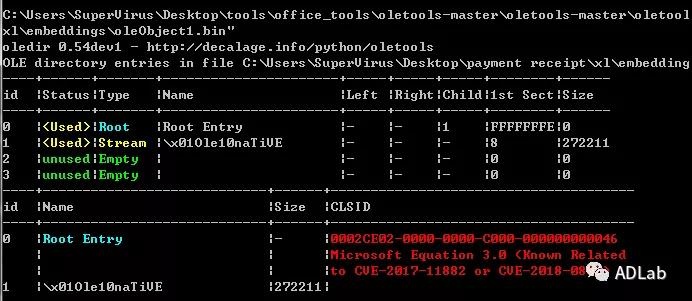 查看ole对象的目录结构,可以看到ole对象已被识别为CVE-2017-11882: