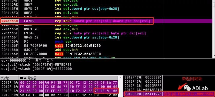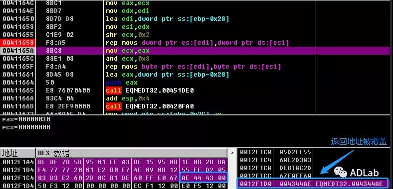 由于该缓冲区溢出函数处于EQNDT32进程中,所以我们提前将EQNDT32.EXE加载起来并找到漏洞溢出处下断点,重新打开诱饵文档后,发现栈中返回地址0x004115D8被覆盖,从而转向shellcode执行。