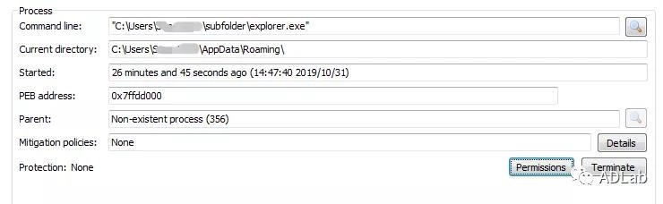 通过分析,可以确定explorer.exe程序是臭名昭著的间谍软件“Agent Tesla”。该木马运行后会立即重新创建一个挂起的自身子进程。子进程的相关属性如下图: