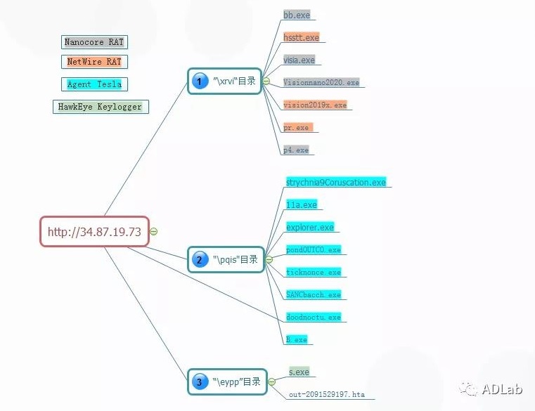 我们首先从恶意文档触发漏洞后执行的shellcode中提取出一个硬编码的链接地址:“http[:]//34.87.19.73/”。经过后台大数据的样本关联分析后,从该托管的外部主机上挖掘出该黑客组织自2019年9月起使用的诸多类型的间谍木马。