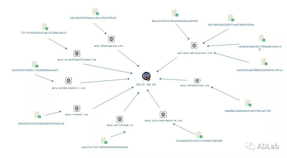 接着,提取该批木马样本使用的C2域名进一步的关联出部分可疑的CC地址。例如,部分木马会将SMTP流量发送到smtp[.]diagnosticsystem.in,而该域名解析的IP地址为208[.]91[.]199[.]143。