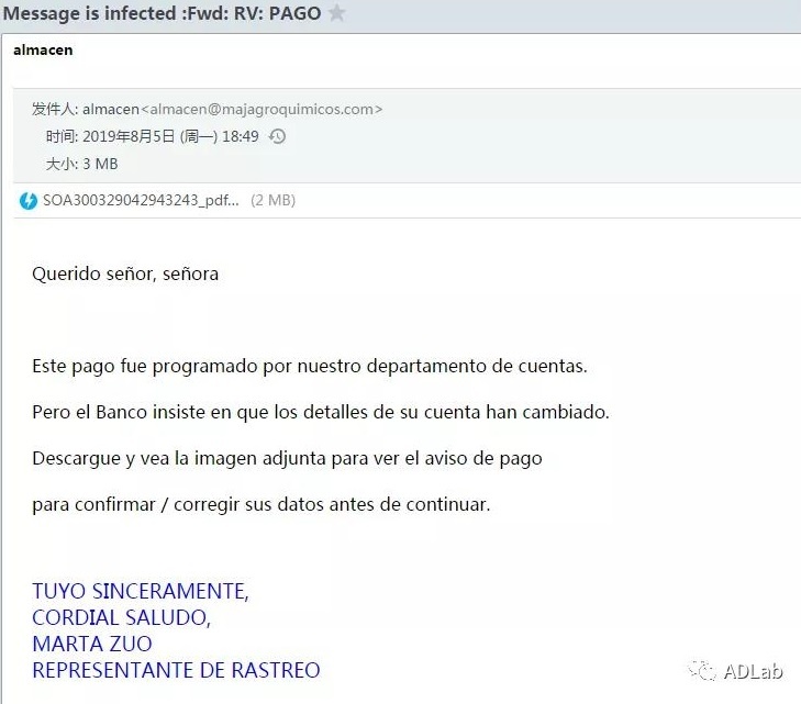 根据同源分析,我们发现了另外一封针对西班牙地区的钓鱼邮件。该邮件的发件地址是西班牙一家名为“MAJ AGROQUIMICOS”的农药行业公司。