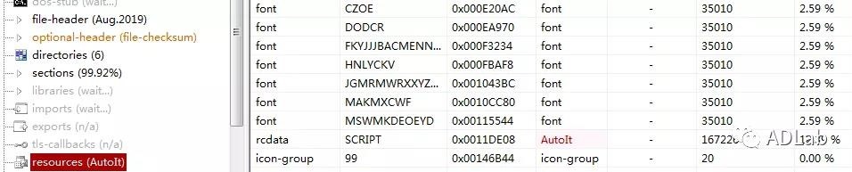 使用分析工具可以看到,这个名为“SOA300329042943243_pdf.exe”的可执行文件实际上是一个AutoIt解释器,并嵌入了AutoIt编译脚本作为资源。