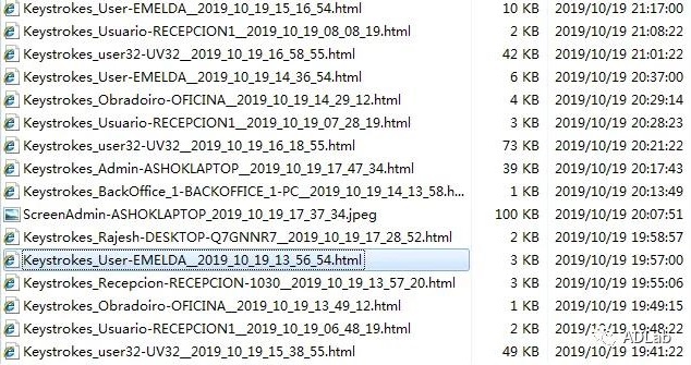 从这些文件名中的:“Keystrokes”(键盘记录)、“Screen”(屏幕截)、“Recovered”(密码恢复)等关键字可以看出,木马是根据黑客的控制指令来窃取受害者的相关信息,且按照“功能-用户名-计算机名-时间(年-月-日-时-分-秒)”的结构命名并保存为HTML格式的文件。