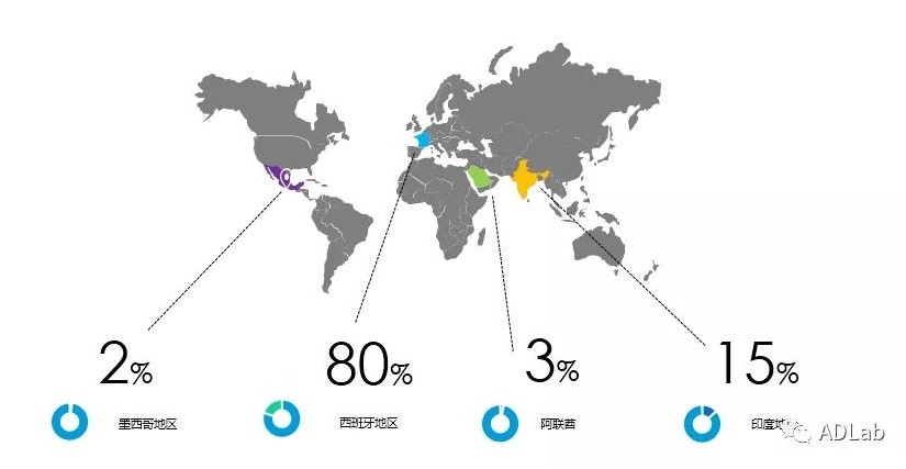 受害者IP地址主要分布在西班牙、印度,以及少量来自阿联酋和墨西哥地区,其大概占比率如下图: