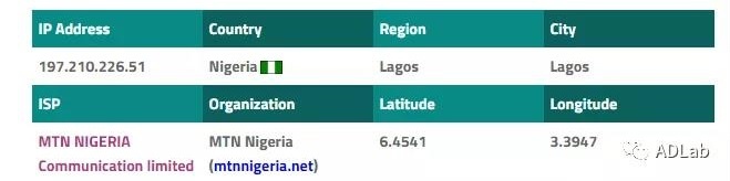 我们提取出了该日志的IP地址“197.210.226.51”。查询后得出该地址位于尼日利亚地区:
