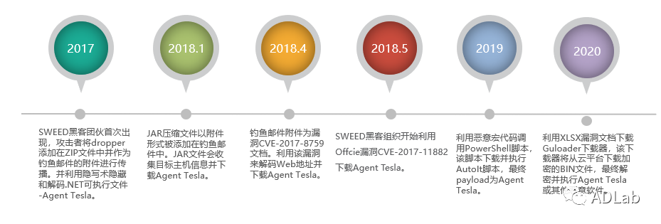 为了对黑客组织在此次攻击活动使用的策略和技术进行全面的了解,启明星辰ADLab研究人员将目前关联到的该组织近几年的主要活动做了梳理和总结,并绘制了“SWEED组织”活动时间轴(如图3-1)。从时间轴可以看出,该组织的大部分活动都具有一致性——借助带有恶意附件的鱼叉式钓鱼邮件分发远控木马程序(RAT),并且行动中使用的木马程序主要是以Agent Tesla为主。