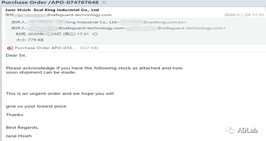 SWEED组织在初始环节主要以投递钓鱼邮件开始展开攻击,攻击者在前期对目标用户进行深入调研,选取与目标用户所属行业或领域相关的内容来构造邮件和恶意文档。随后将精心制作的主题如”采购订单”、“紧急运输文件”、”装船通知单“等文档添加在邮件附件中发送给目标用户,诱使其下载附件,目标用户一旦打开带有漏洞的恶意文档,触发漏洞的恶意代码就将会在后台静默下载和执行恶意软件,从而窃取目标用户的敏感信息并对其主机进行控制。