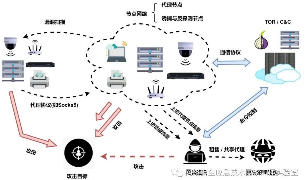 通过我们自己的物联网威胁数据平台及相关情报的交叉印证,发现“僵尸蜜网”包含两类样本。第一类是诱捕与反探测节点,对该样本进行二进制文件相似度比对发现其攻击模块和通信协议与Moobot家族高度相似,推测与Moobot家族同源,因此将这类新型的恶意程序命名为Moobot_Trap,其借鉴了蜜罐的设计思想,除了伪装自身为其他设备外,还能通过诱捕其它攻击者的漏洞利用情报与攻击样本,来灵活快速的升级其武器库,加强自身的攻击与防御能力。第二类是构建代理网络的恶意代理节点,我们将其命名为Mal_Proxy,通过下发恶意代理模块,攻击者能够将受感染或购置的设备作为新节点来代理任意流量,进而不断发展壮大其代理网络。恶意流量经代理网络中转至Tor网络或真实C&C,一方面可以避免直接暴露身份,另一方面也能更好的穿透某些网络防火墙的限制。通过目前掌握的数据结合物联网僵尸样本的分析,我们还原出了该僵尸网络的攻击模型如图2所示: