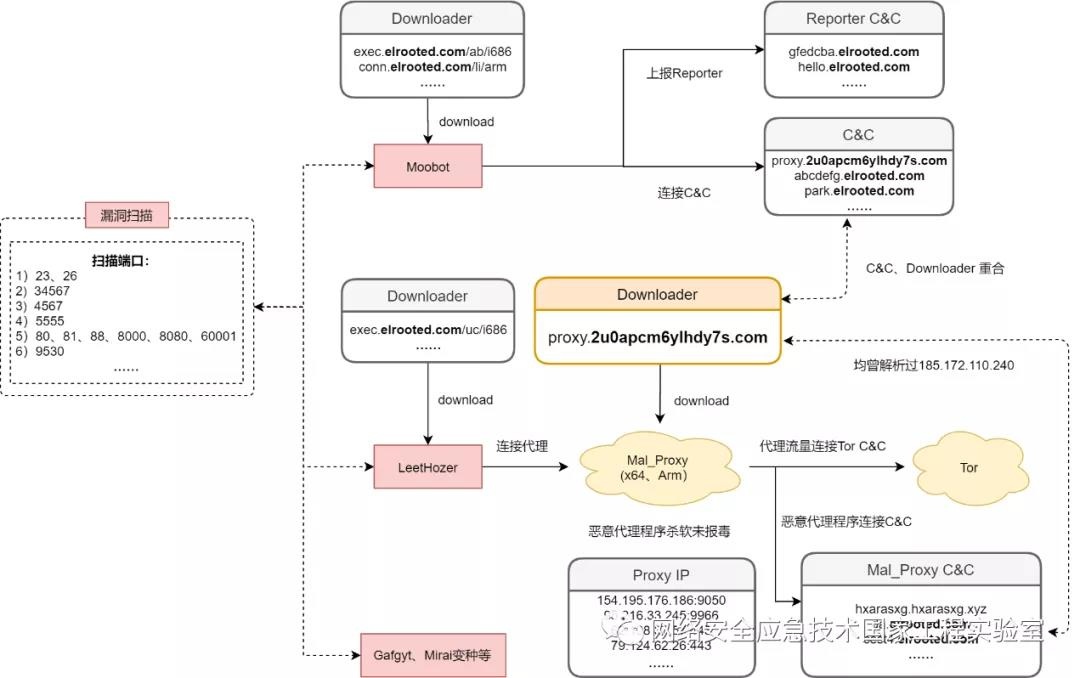 在追踪过程中,我们发现“僵尸蜜网”与多个僵尸网络间存在较强的关联性,包括Moobot、LeetHozer以及Gafgyt变种等等。以Moobot和LeetHozer两类僵尸网络为例,proxy.2u0apcm6ylhdy7s.com域名曾作为Mal_Proxy的Downloader URL以及Moobot的C2;elrooted.com相关子域名曾用于Mal_Proxy的C2以及Moobot、LeetHozer的Downloader URL,类似域名资产重用的现象,表明两类僵尸很有可能源自同一组织。我们整理了关联样本的传播和执行流程如图3所示: