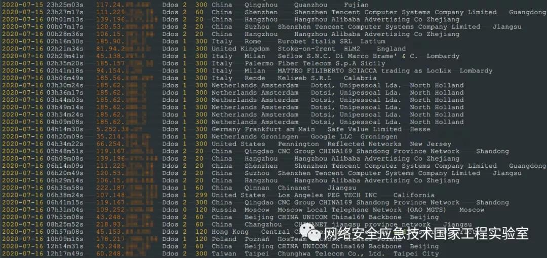 根据目前的监测情况,该组织单日发起的攻击次数约在100次左右,被攻击目标则主要分布在中国、美国、俄罗斯、德国等国家,其中针对我国的攻击大多集中在新疆、河南、江苏、台湾等地区,攻击记录示例如图4:
