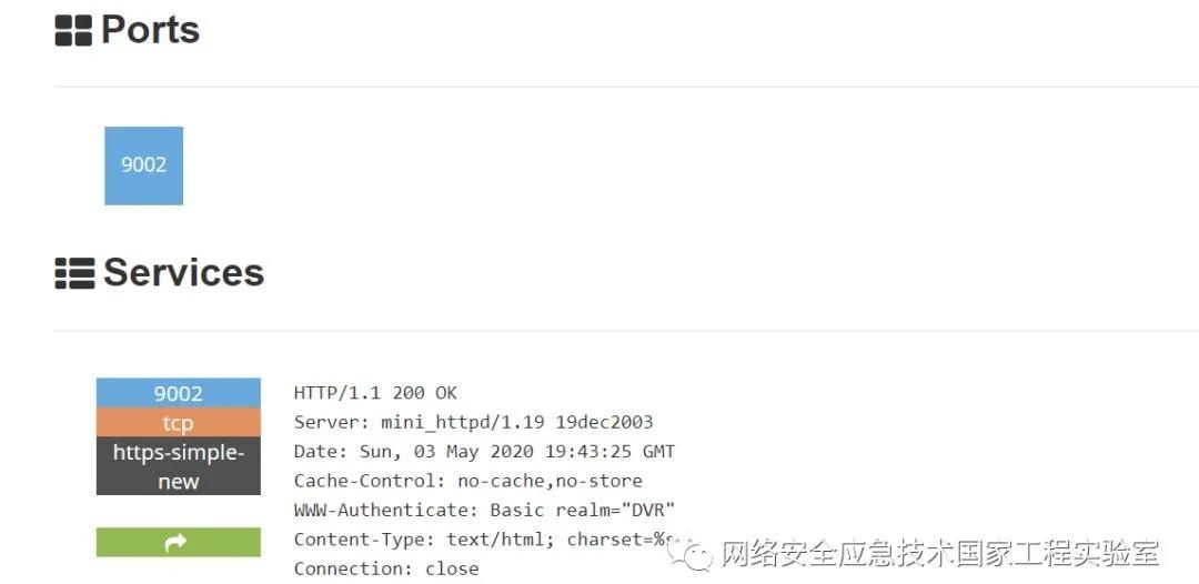 ( 1 ) 反探测:目前最为主流的设备探测技术依然是基于指纹实现的,如Shodan、ZoomEye、Censys以及各类漏洞扫描产品,因而Moobot_Trap还提供一类能力就是给扫描源提供伪造的信息,以欺骗扫描引擎做出错误的决策。一则Moobot_Trap可以将自身伪装成为一个坚不可摧的设备,让扫描引擎认为这是一台安全的设备而降低被发现的几率;一则Moobot_Trap也可以将入侵的设备伪装成为一个存在新公开漏洞的设备,其可以起到诱捕一些未公开的漏洞利用代码。在我们当前所发现的僵尸网络中,其中被入侵的任何一台设备都将被识别成为一个提供mini_httpd服务的DVR设备(用于诱捕Mini_httpd1.19相关的漏洞利用代码)。